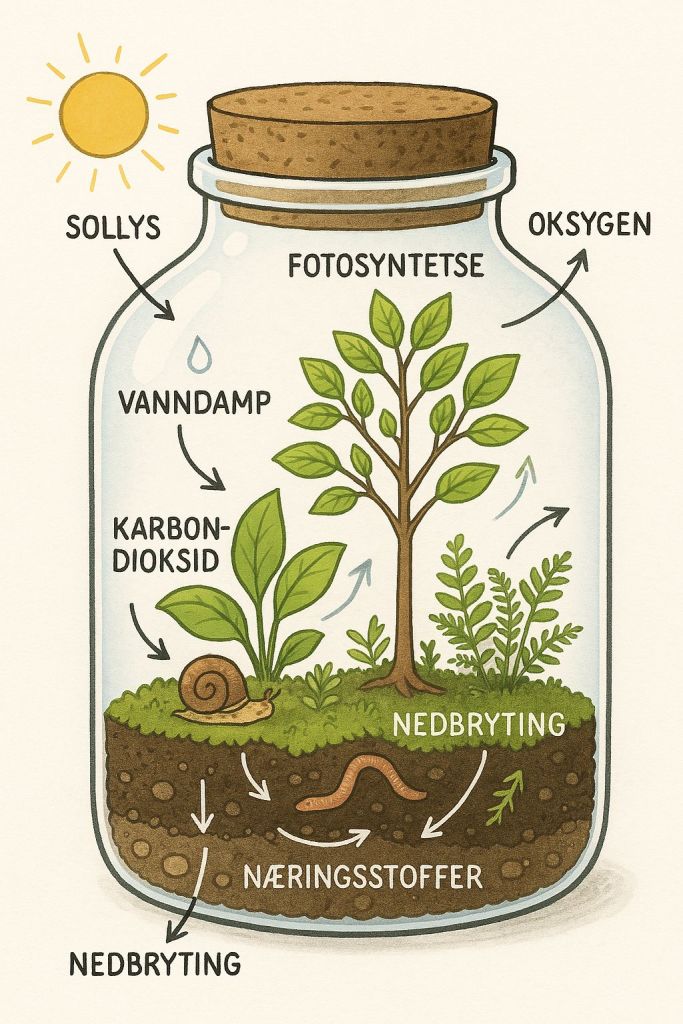 I et lukket terrarium finnes et balansert mikroøkosystem, hvor lys gir energi til plantene, plantene produserer oksygen, og nedbrytere (som bakterier og sopp) resirkulerer næringsstoffer. Vannsyklusen holder fuktigheten i gang, og planter, dyr og mikroorganismer er alle i et nært samarbeid for å opprettholde et stabilt, bærekraftig miljø.
